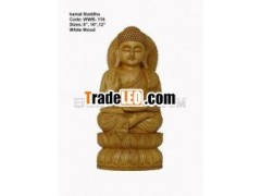 Hand Carved Wooden Buddha Statuein Dhyan Mudra Sitting on Lotus Gautama Buddha was born in 563 B.C.in northeast India. The Buddha was the son of the King of theShakyas. Suddhodana, who ruled at Kapilavastu, on the border ofNepal. His mother was Queen Maya. He was named Siddartha. He livedamidst the pleasures of palace life and at age 16 he was married toPrincess Yasodhara. They had a son named Rahula. After seeing adecrepit old man, an invalid, and an ascetic beggar, he learned ofsuffering and decided to embrace asceticism. Soon afterward, at age29, Siddhartha left the palace and his family and went to ahermitage where he became monk Guatama, or, as he is still called,Shakyamuni (The ascetic of the Shakyas). One day, meditating undera sacred fig tree, he attained perfect illumination (Bodhi). He hadbecome a Buddha. From there on he traveled and preached for 44years what was to become one of the main religions of the world. Hedied at Kusinagara at age 80. Here Buddha is depicted in the Earth.As the Buddha drew near to his enlightenment experience, he wasassailed by the forces of temptation (Mara). He remained steadfast,however, and reached down to call upon the Earth to witness his vowto be unmoved by any temptation. Thus, it is a gesture ofdetermination, reflecting the immovable, unshakable aspect ofmeditation.